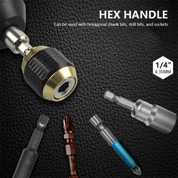 Upgrade your drilling experience with our Hex Shank Quick Coupling! Crafted from high-quality carbon steel, this connector ensures durability and seamless task switching for your electric drill. Its non-slip round handle offers comfortable grip and easy one-hand operation, enabling quick bit replacement in seconds. Compatible with electric drill chucks without quick function, it facilitates swift accessory changes with its universal 1/4 Hexagon Handle. Plus, it includes a connection screw extractor for added versatility. Perfect for various tasks like deck building, wood framing, and installing plywood subfloor. Get yours now for hassle-free drilling sessions!