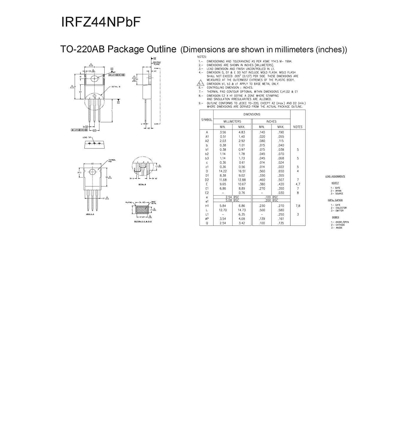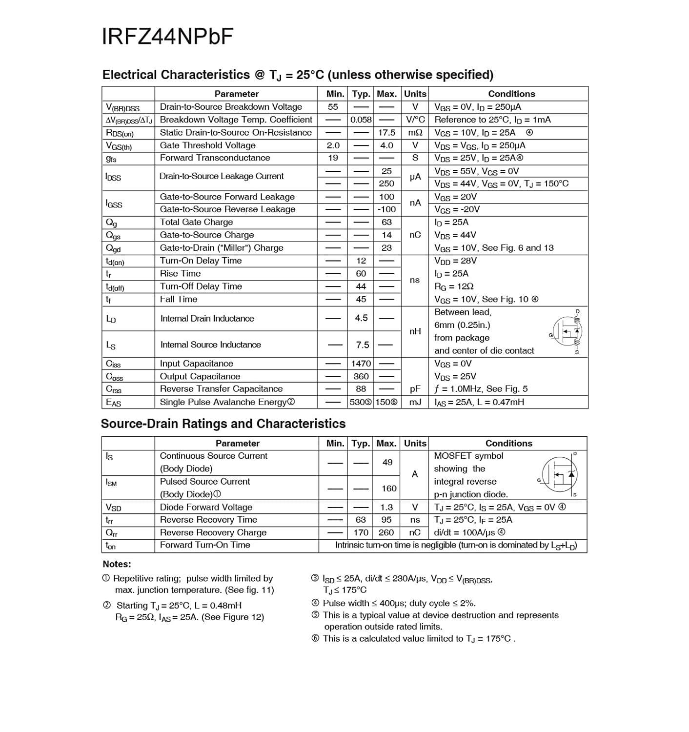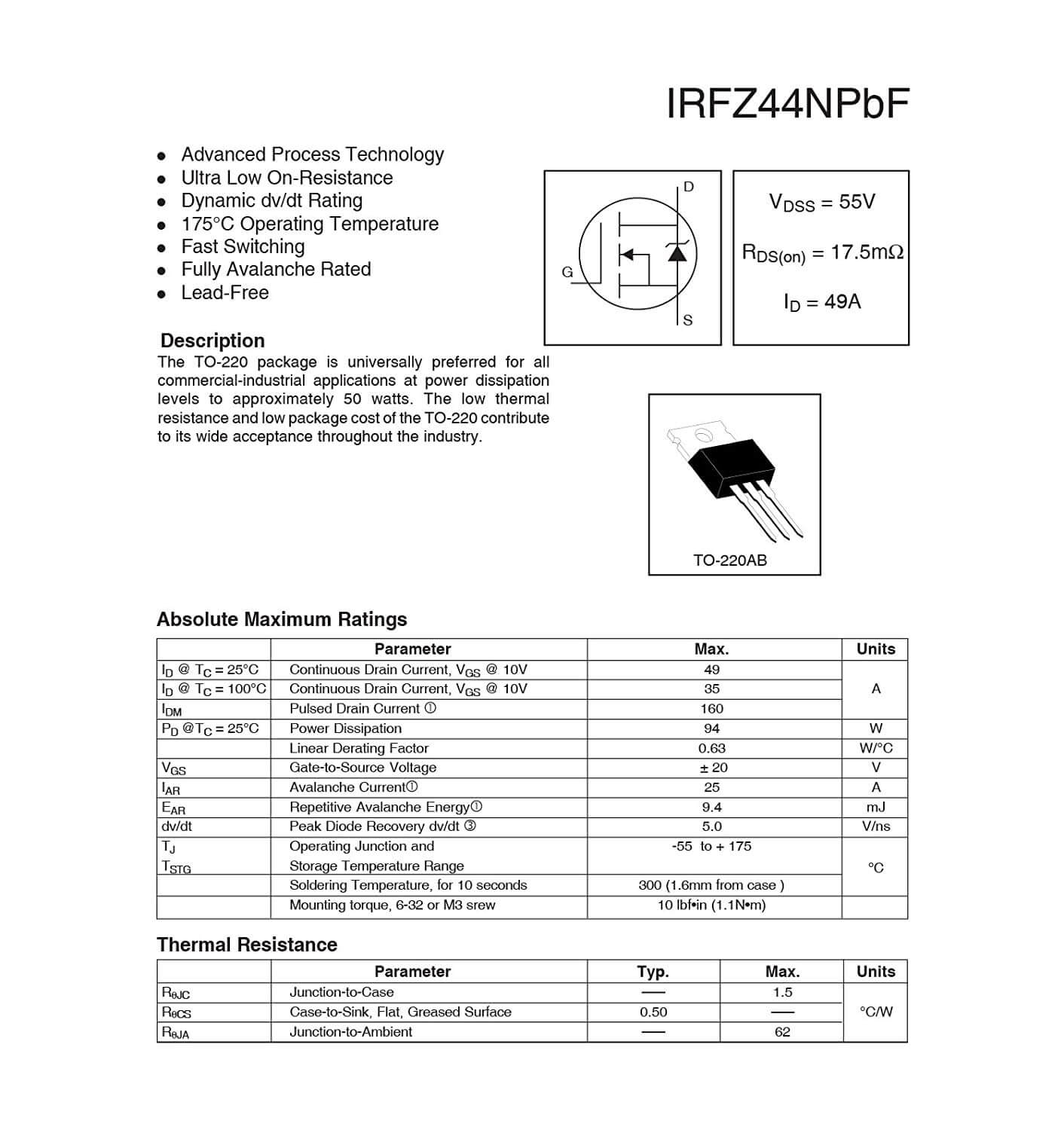 IRFZ44N is specifically designed for Automotive applications, this HEXFET® Power MOSFET utilizes the latest processing techniques to achieve extremely low on resistance per silicon area. Additional features of this design are a 175°C junction operating temperature, fast switching speed and improved repetitive avalanche rating . These features combine to make this design an extremely efficient and reliable device for use in Automotive applications and a wide variety of other applications.